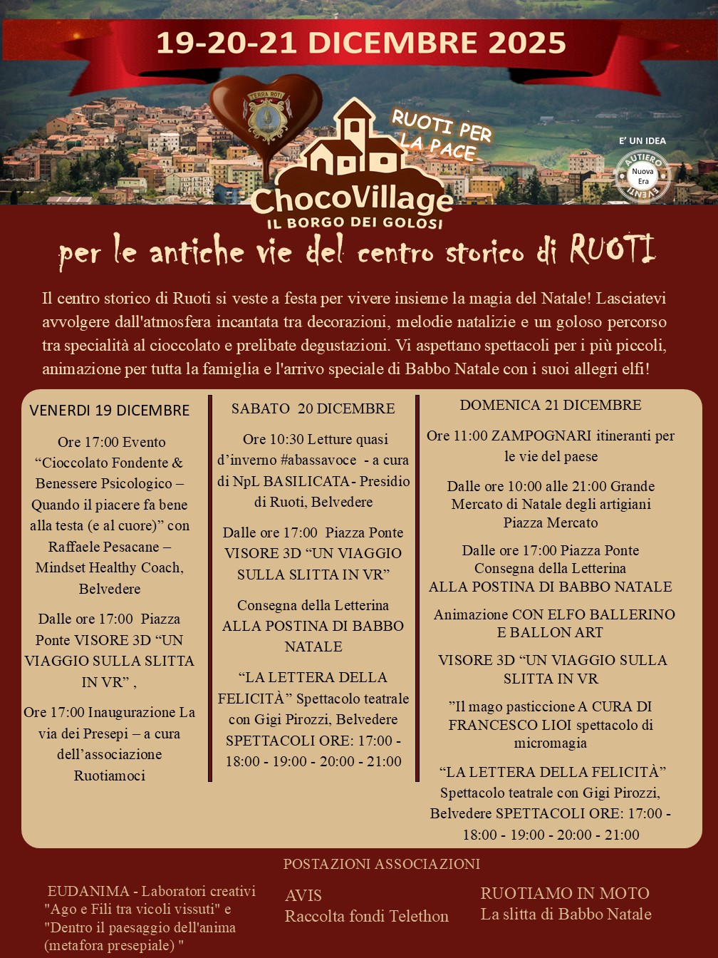Descrizione title Dal 19 al 21 dicembre 2025 il centro storico di Ruoti si trasforma in un villaggio incantato fatto di cioccolato, spettacoli, artigianato e solidarietà. Tra antiche vie, profumi natalizi, animazione per grandi e piccoli e tante dolci degustazioni, ChocoVillage celebra il Natale con dolcezza, speranza e condivisione.