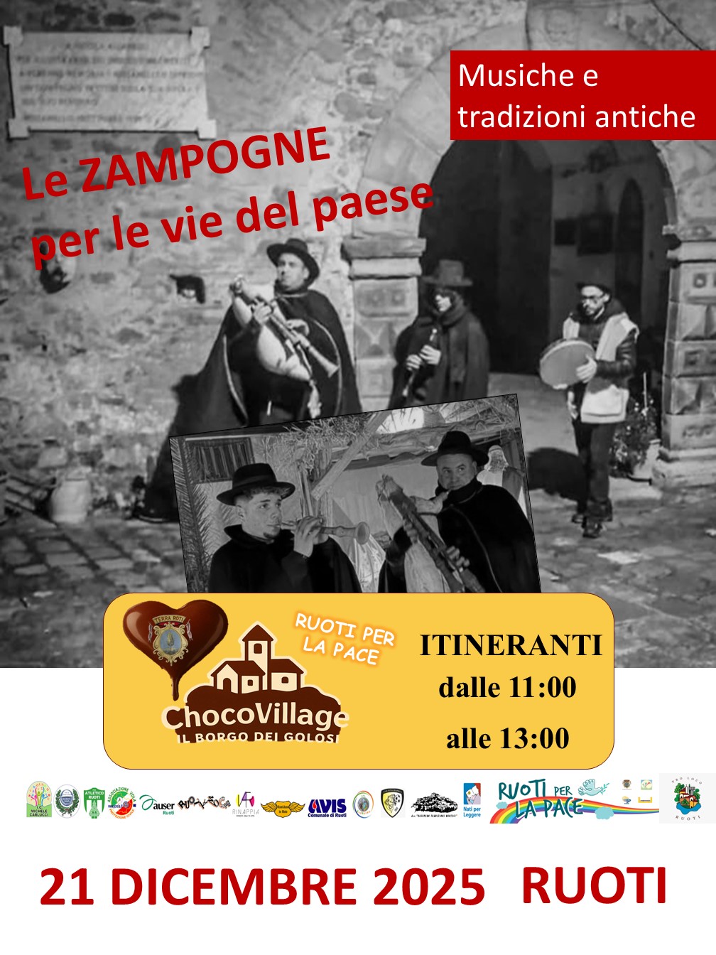Descrizione title Le note delle zampogne risuonano tra le strade di Ruoti, riportando in vita atmosfere antiche e suggestioni natalizie. Un percorso musicale itinerante che celebra la tradizione popolare, emoziona grandi e piccoli e accompagna il paese verso il Natale.