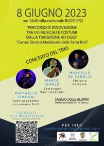 Giovedì 8 giugno alle ore 18.00 presso la villa comunale del comune di Ruoti, in provincia di Potenza, ci sarà il terzo appuntamento del “Percorso di innovazione tra usi musicali e costumi dalla tradizione ad oggi” nell’ambito del “Corteo Storico Medievale della Terra Roti”.